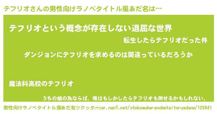 | 女子向けラノベタイトル風あだ名 | 『テフリオの卵を拾いまして』 |