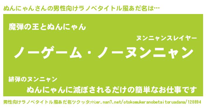 | 女子向けラノベタイトル風あだ名 | 『死神ぬんにゃんの再婚』 |