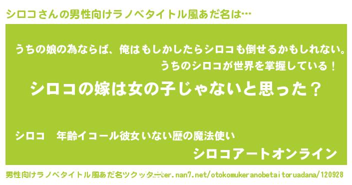 | 女子向けラノベタイトル風あだ名 | 『シロコの卵を拾いまして』 |