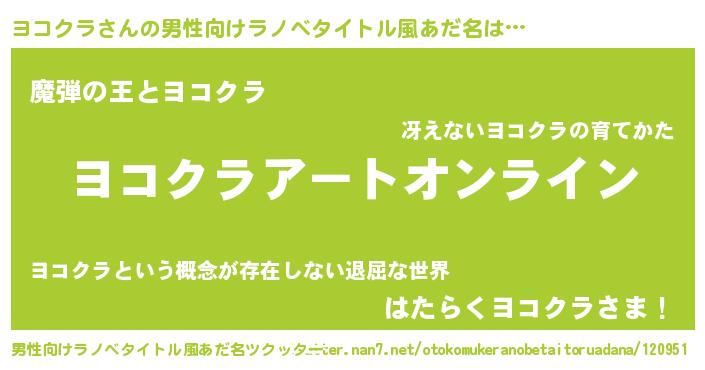 | 女子向けラノベタイトル風あだ名 | 『誰かこのヨコクラを説明してください! ~契約から始まるウェディング~』 |