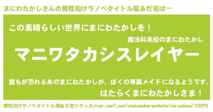 まにわたかしさんの男性向けラノベタイトル風あだ名をツクッター!