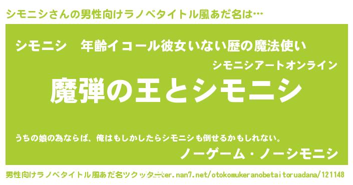 | 女子向けラノベタイトル風あだ名 | 『乙女ゲームの破滅フラグしかない悪役シモニシに転生してしまった…』 |