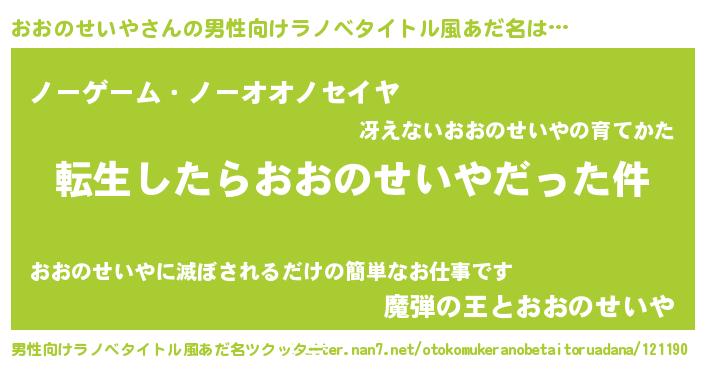 | 女子向けラノベタイトル風あだ名 | 『おおのせいやの玉の輿計画!』 |