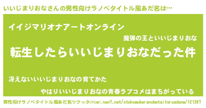 | 女子向けラノベタイトル風あだ名 | 『いいじまりおなの玉の輿計画!』 |