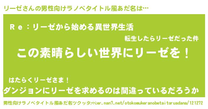 | 女子向けラノベタイトル風あだ名 | 『悪役リーゼに転生したようですが、知った事ではありません』 |