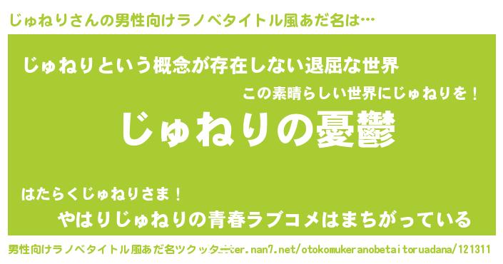 | 胡散臭い通販商品みたいなあだ名 | 『モテモテ間違いなしブレスレット…その名も「じゅねり」』 |