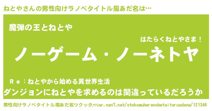 | 女子向けラノベタイトル風あだ名 | 『死神ねとやの再婚』 |