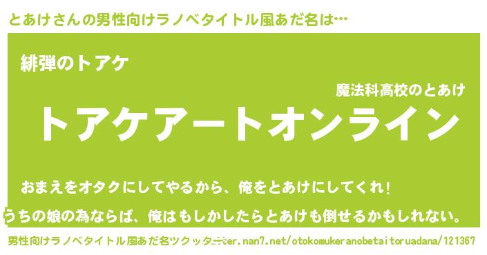 | 胡散臭い通販商品みたいなあだ名 | 『億万長者になれるブレスレット…その名も「とあけ」』 |
