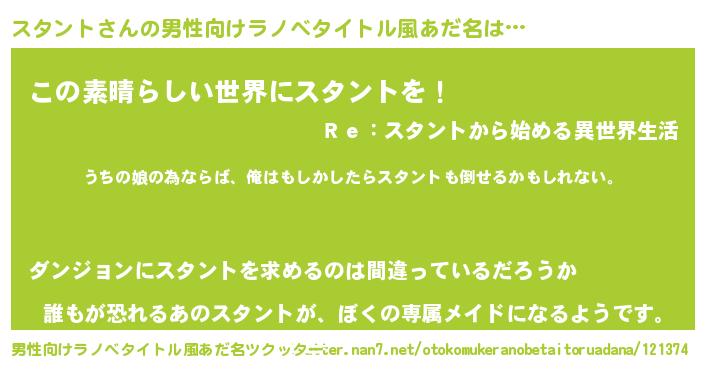 | 女子向けラノベタイトル風あだ名 | 『スタントの婚約者』『闇のスタント』 |