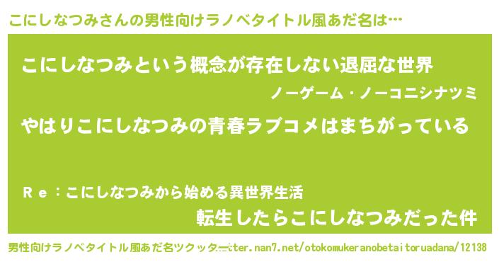 | 女子向けラノベタイトル風あだ名 | 『こにしなつみ伯爵の花嫁』 |