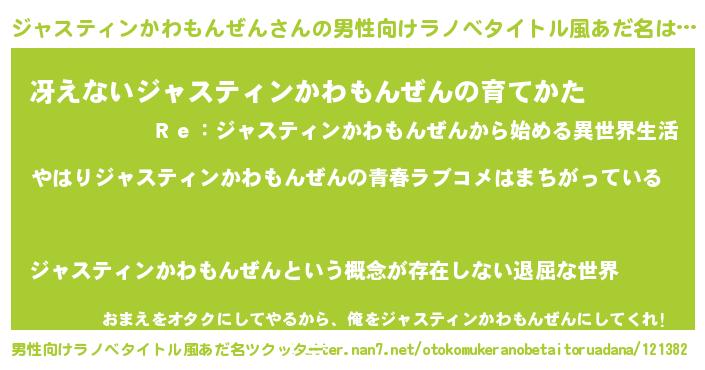 | 女子向けラノベタイトル風あだ名 | 『ジャスティンかわもんぜんの雑貨屋さん』 |