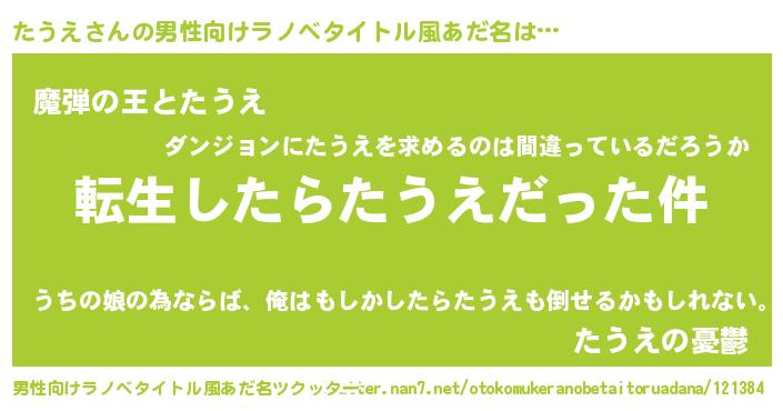 | 胡散臭い通販商品みたいなあだ名 | 『世界中を虜にした世界で10本だけ現存している希少なブランデー…その名も「たうえ」』 |