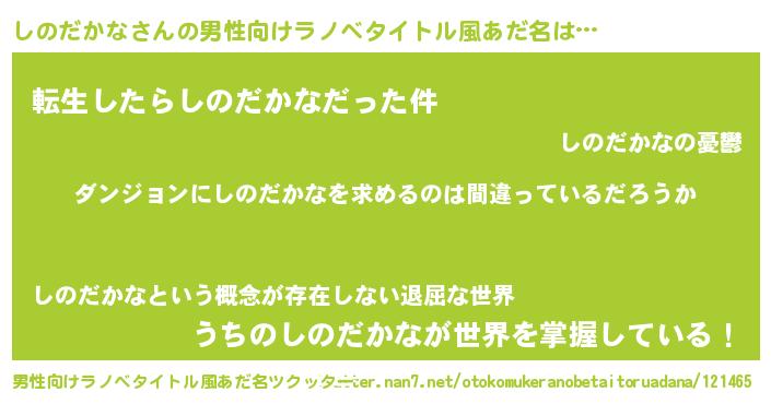 | 胡散臭い通販商品みたいなあだ名 | 『信頼と実績のサプリメント…その名も「しのだかな」』 |