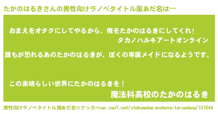 | 女子向けラノベタイトル風あだ名 | 『異世界でカフェたかのはるきを開店しました。』 |