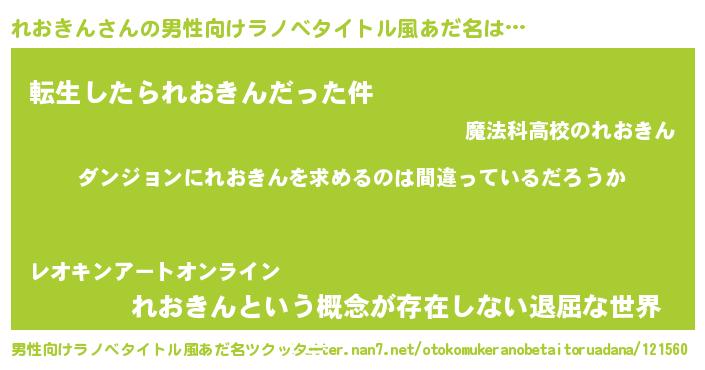 | 女子向けラノベタイトル風あだ名 | 『れおきんは平凡を望む』 |