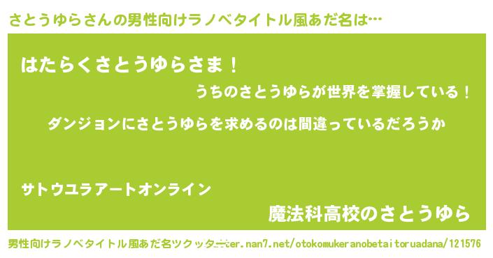 | ヒーロー風カッコイイあだ名 | 『魔戒騎士サト』『スーパーサトウユラ』 |