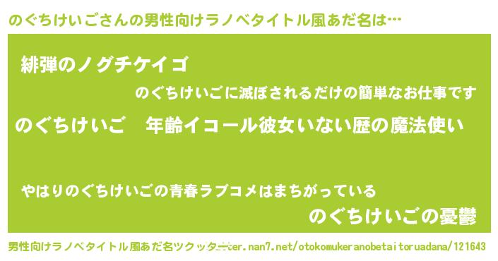| 女子向けラノベタイトル風あだ名 | 『のぐちけいごの玉の輿計画!』 |