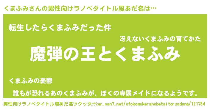 | 女子向けラノベタイトル風あだ名 | 『乙女ゲームの破滅フラグしかない悪役くまふみに転生してしまった…』 |