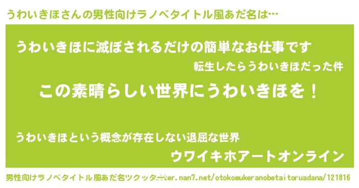 | 女子向けラノベタイトル風あだ名 | 『悪役うわいきほに転生したようですが、知った事ではありません』 |