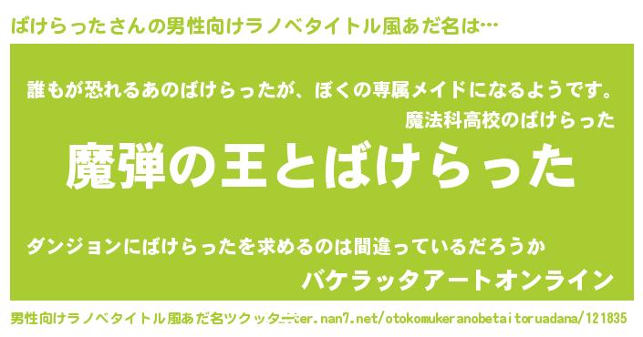 | 女子向けラノベタイトル風あだ名 | 『ばけらったが死なない童話 林檎のばけらったの診療簿』 |