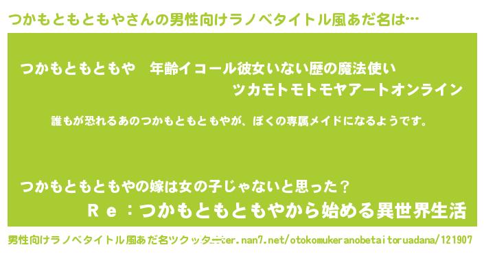 | 女子向けラノベタイトル風あだ名 | 『異世界でカフェつかもともともやを開店しました。』 |
