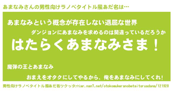 | 胡散臭い通販商品みたいなあだ名 | 『絶対に幸福をもたらす水素水…その名も「あまなみ」』 |