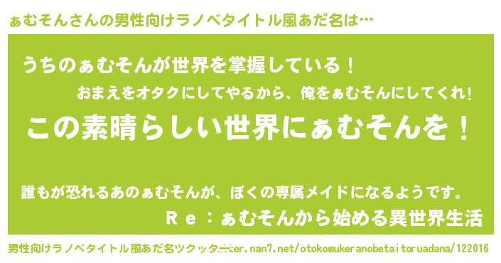 | 女子向けラノベタイトル風あだ名 | 『乙女ゲームの破滅フラグしかない悪役ぁむそんに転生してしまった…』 |