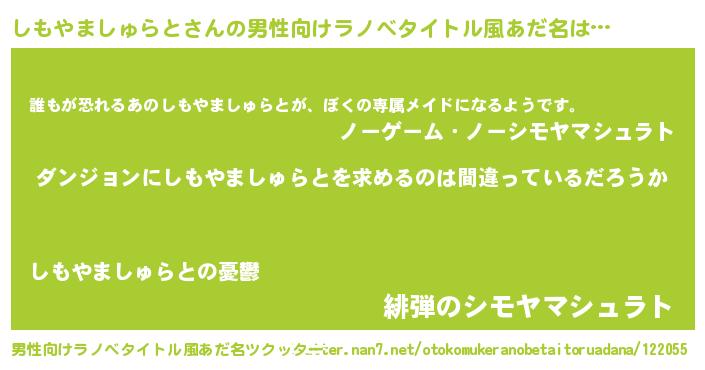 | 女子向けラノベタイトル風あだ名 | 『しもやましゅらとは平凡を望む』 |