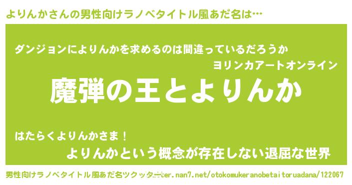 | 女子向けラノベタイトル風あだ名 | 『よりんかが死なない童話 林檎のよりんかの診療簿』 |