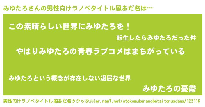 | 女子向けラノベタイトル風あだ名 | 『みゆたろ伯爵の花嫁』 |
