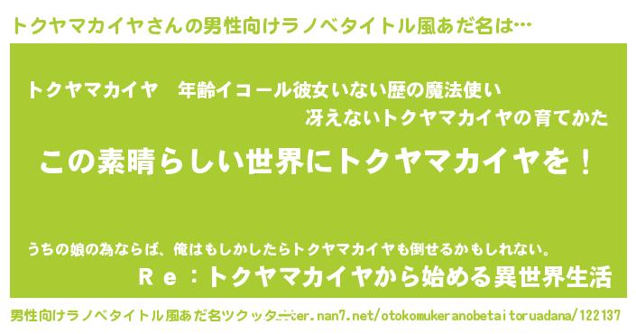 | 胡散臭い通販商品みたいなあだ名 | 『あなたにだけ特別に提供する100年もののヴィンテージワイン…その名も「トクヤマカイヤ」』 |