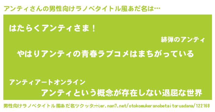 | ファンタジー風あだ名 | 『エターナルアンティー』『アンフェル』 |