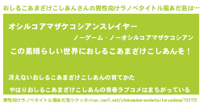 | 女子向けラノベタイトル風あだ名 | 『悪役おしるこあまざけこしあんに転生したようですが、知った事ではありません』 |