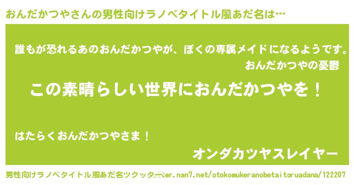 | 女子向けラノベタイトル風あだ名 | 『悪役おんだかつやに転生したようですが、知った事ではありません』 |