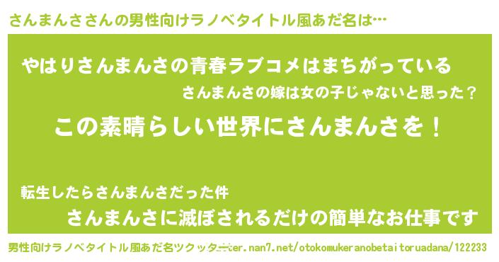 | 萌えアニメ | 物語のオチ『さんまんささんがダークサイドから帰ってきてヒロインが抱きついてEND』 |