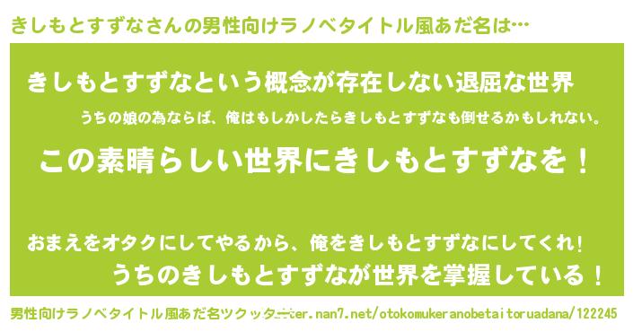 | 女子向けラノベタイトル風あだ名 | 『乙女ゲームの破滅フラグしかない悪役きしもとすずなに転生してしまった…』 |