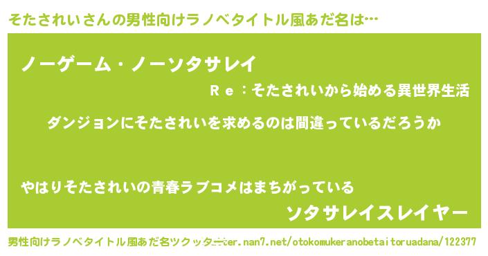 | 女子向けラノベタイトル風あだ名 | 『そたされいの卵を拾いまして』 |