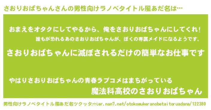 | 女子向けラノベタイトル風あだ名 | 『横柄さおりおばちゃんと宰相陛下』 |