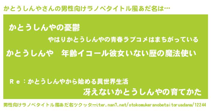 | 女子向けラノベタイトル風あだ名 | 『かとうしんやの玉の輿計画!』 |