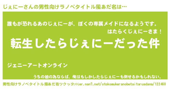| 女子向けラノベタイトル風あだ名 | 『じぇにーの玉の輿計画!』 |