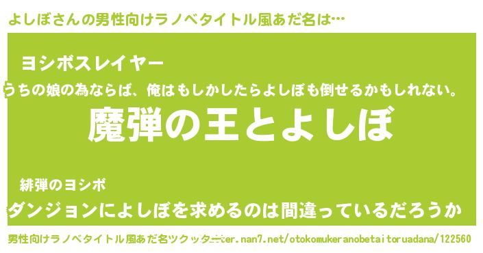 | 女子向けラノベタイトル風あだ名 | 『乙女ゲームの破滅フラグしかない悪役よしぼに転生してしまった…』 |