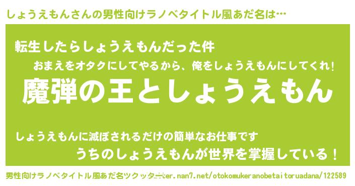 | 女子向けラノベタイトル風あだ名 | 『乙女ゲームの破滅フラグしかない悪役しょうえもんに転生してしまった…』 |