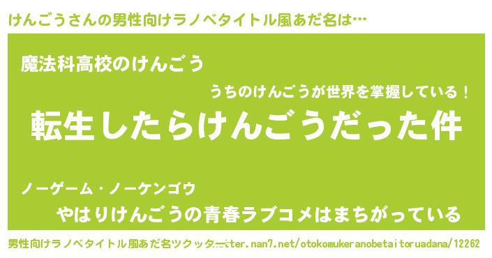| ヘコむあだ名 | 『豆乳』『けんごう(苦笑)』『けんを』 |