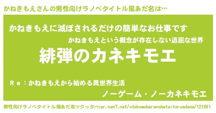 | 女子向けラノベタイトル風あだ名 | 『シンデレラかねきもえ家の靴箱館』 |