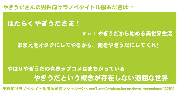 | 女子向けラノベタイトル風あだ名 | 『やぎうだ夫妻のなれそめ』 |
