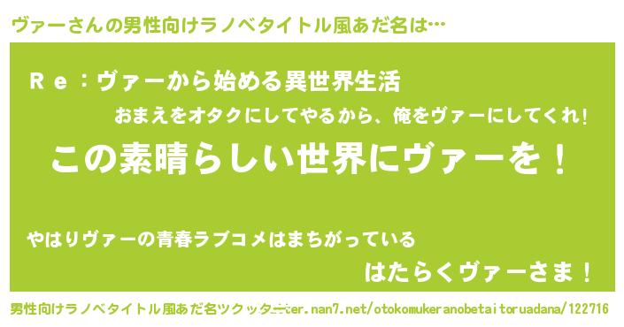 | 胡散臭い通販商品みたいなあだ名 | 『あなたにだけ特別に提供する限定10本のレアな日本酒…その名も「ヴァー」』 |