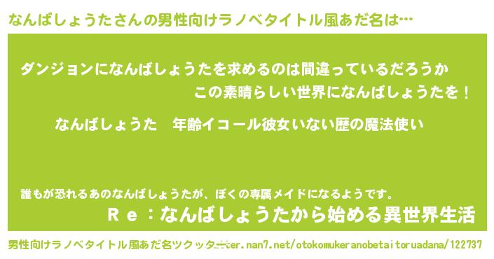 | 女子向けラノベタイトル風あだ名 | 『なんばしょうたの玉の輿計画!』 |