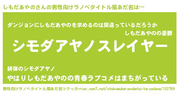 | 胡散臭い通販商品みたいなあだ名 | 『信頼と実績のペンダント…その名も「しもだあやの」』 |