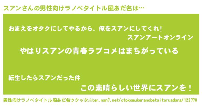 | 女子向けラノベタイトル風あだ名 | 『スアンの雑貨屋さん』 |