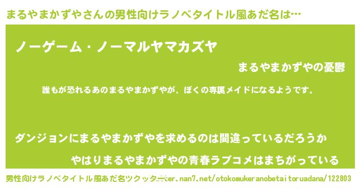 | 女子向けラノベタイトル風あだ名 | 『まるやまかずやの契約王妃』 |